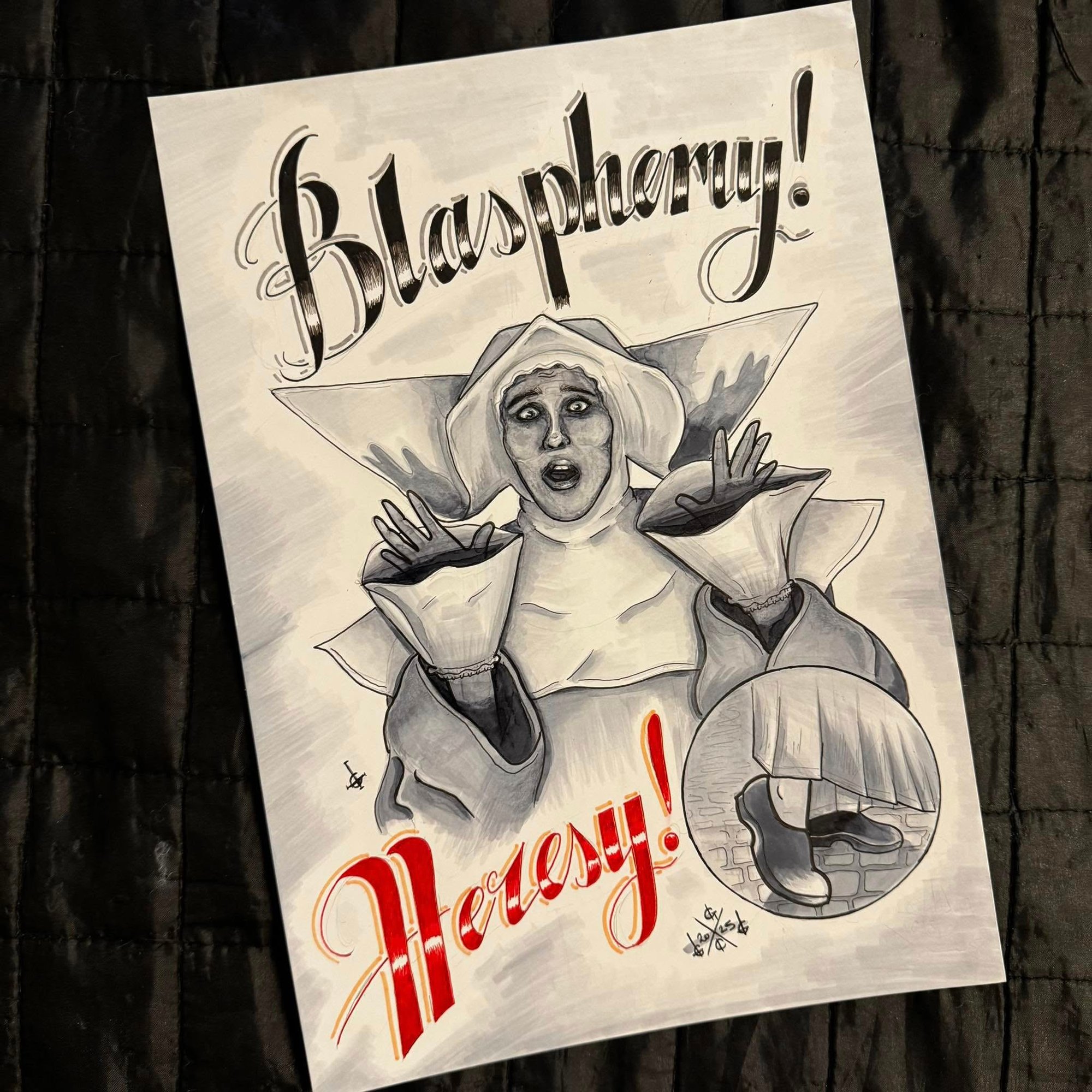 Design features “Blasphemy! Heresy!” quote from the song in a mixture of script and scratch fonts, alongside a stylised drawing of a nun.