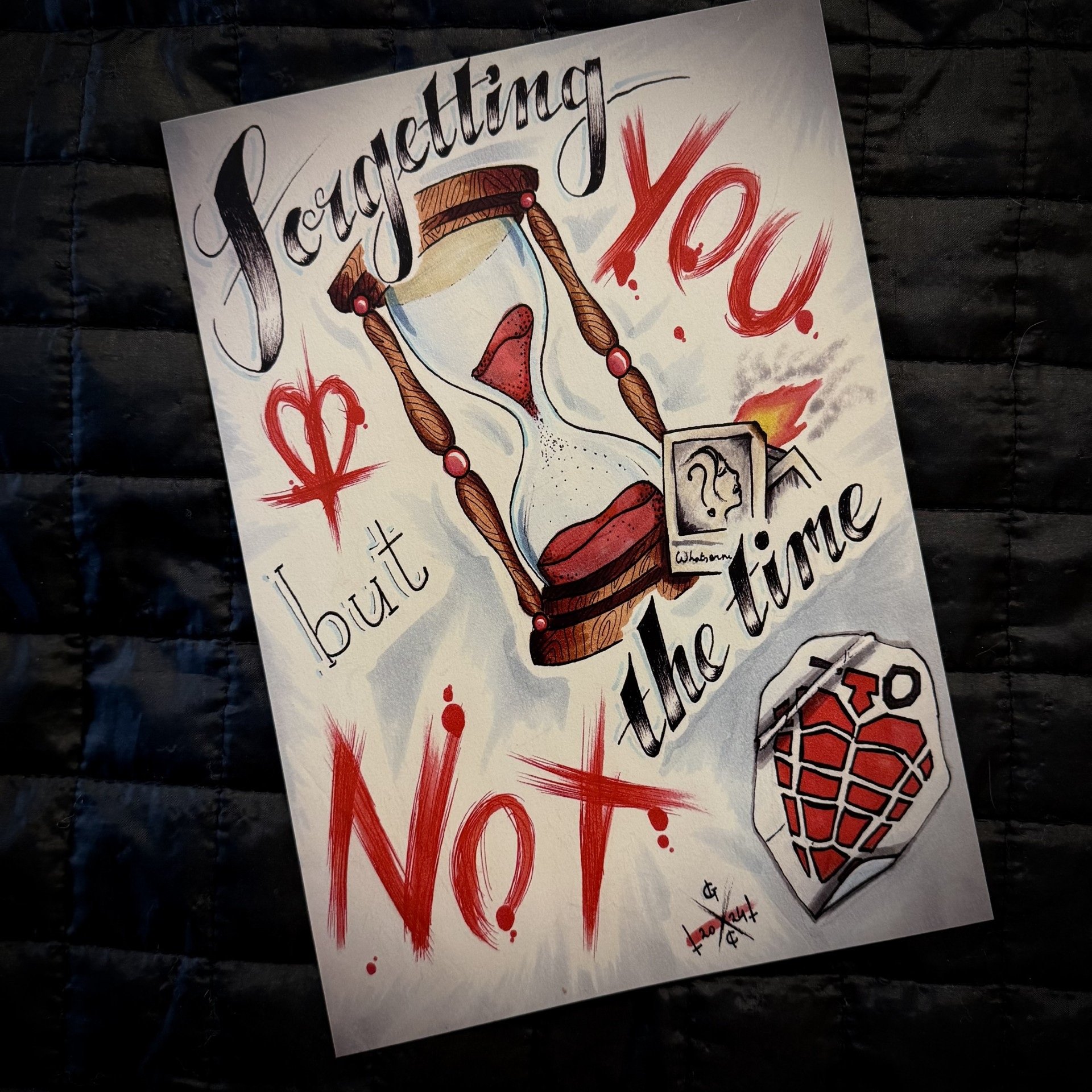Design features lyrics "Forgetting you but not the time" from the song in a mixture of script and scratch fonts. Artwork also features of burning photographs and heart grenade "sticker" sketch with the St Jimmy cross on a sky blue background.